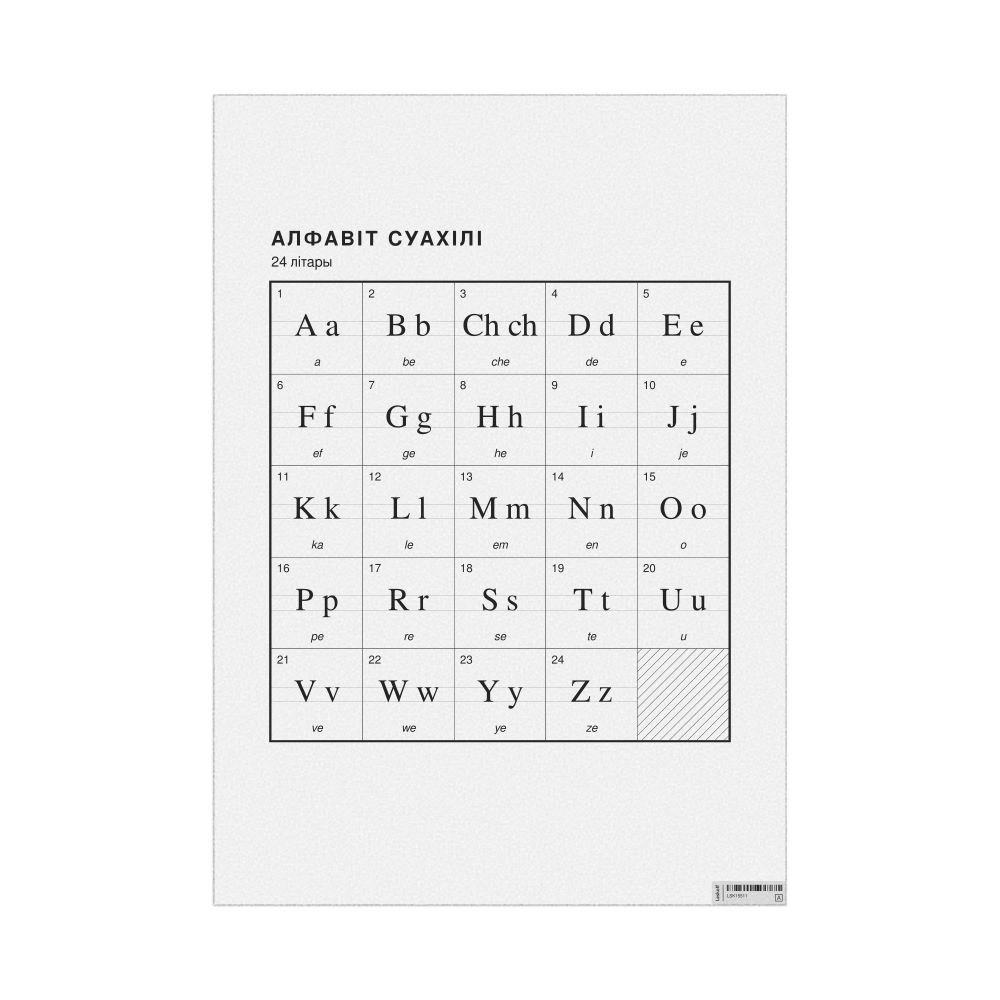 The Swahili alphabet chart (the full set of letters) labeled in Belarusian (Алфавіт суахілі) in the 23.4 x 33.1 in (59.4 x 84.1 cm, poster / wall chart) format.