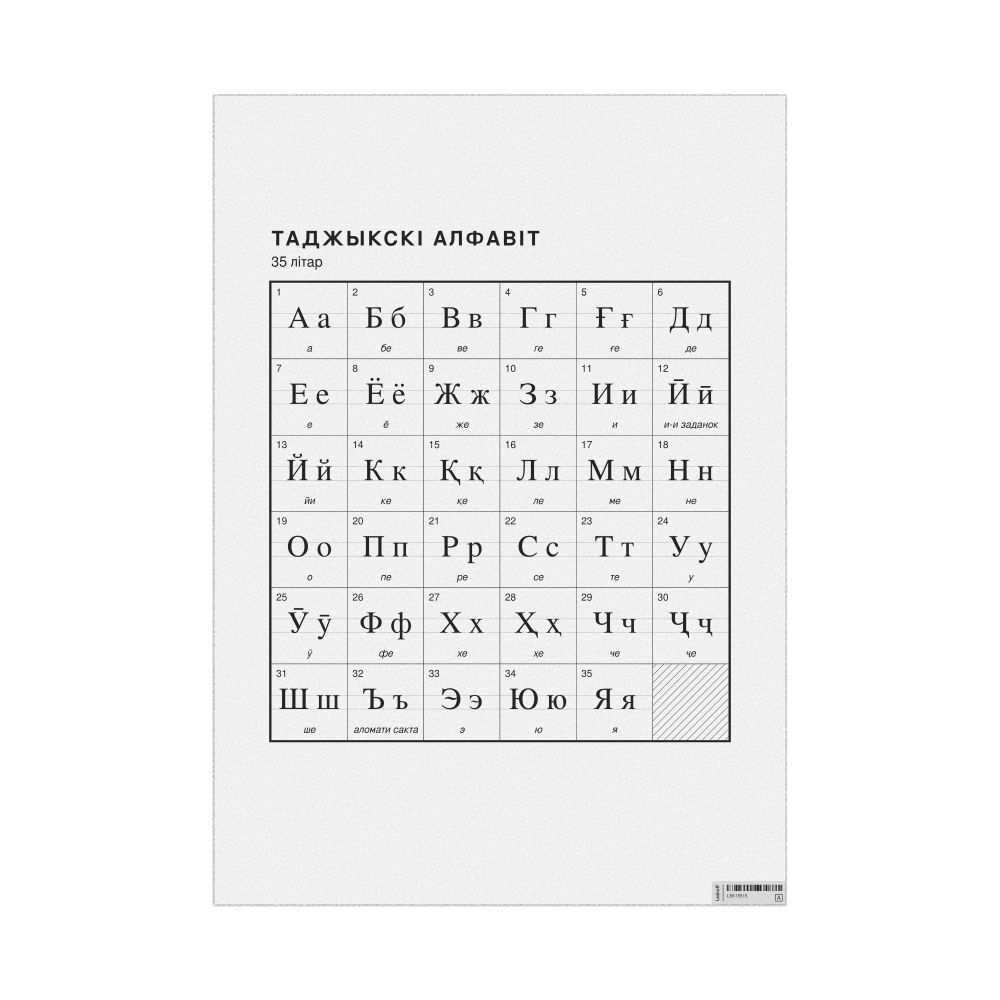 The Tajik alphabet chart (the full set of letters) labeled in Belarusian (Таджыкскі алфавіт) in the 23.4 x 33.1 in (59.4 x 84.1 cm, poster / wall chart) format.
