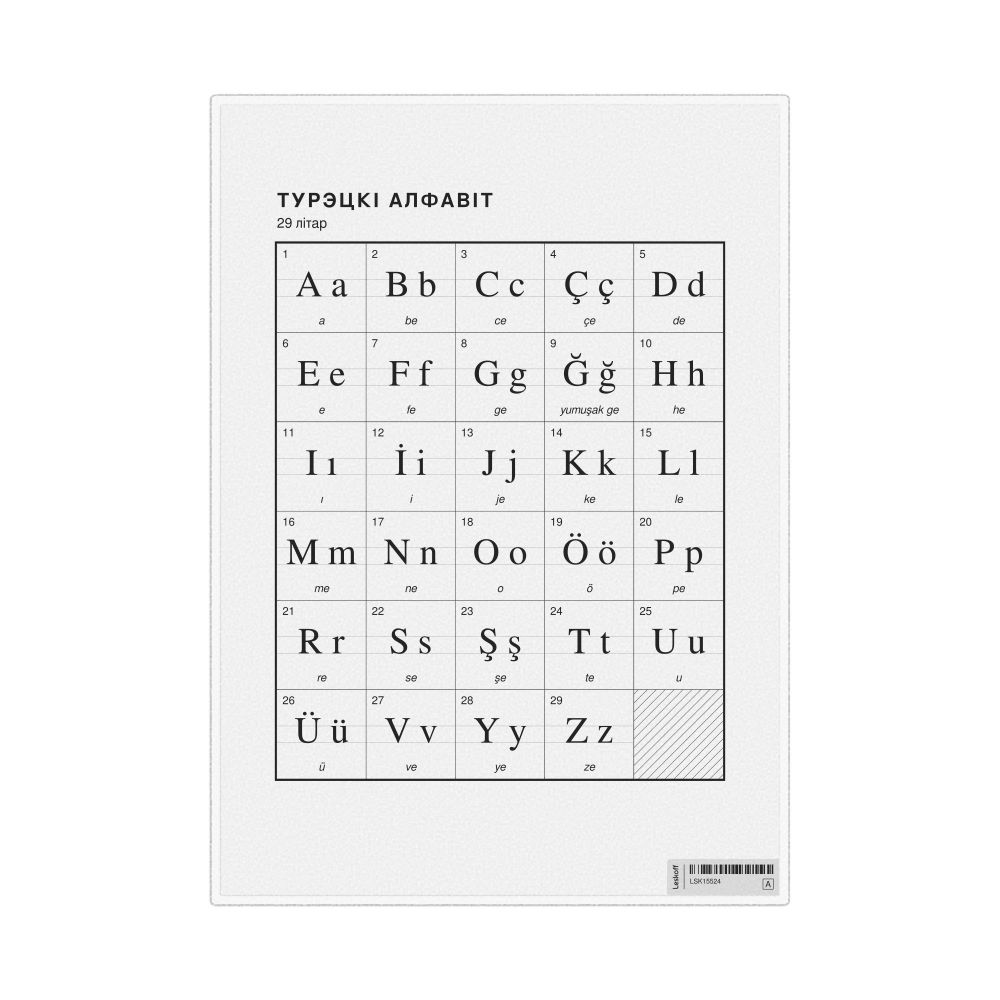 The Turkish alphabet chart (the full set of letters) labeled in Belarusian (Турэцкі алфавіт) in the 8.3 x 11.7 in (21.0 x 29.7 cm, desk chart, laminated) format.