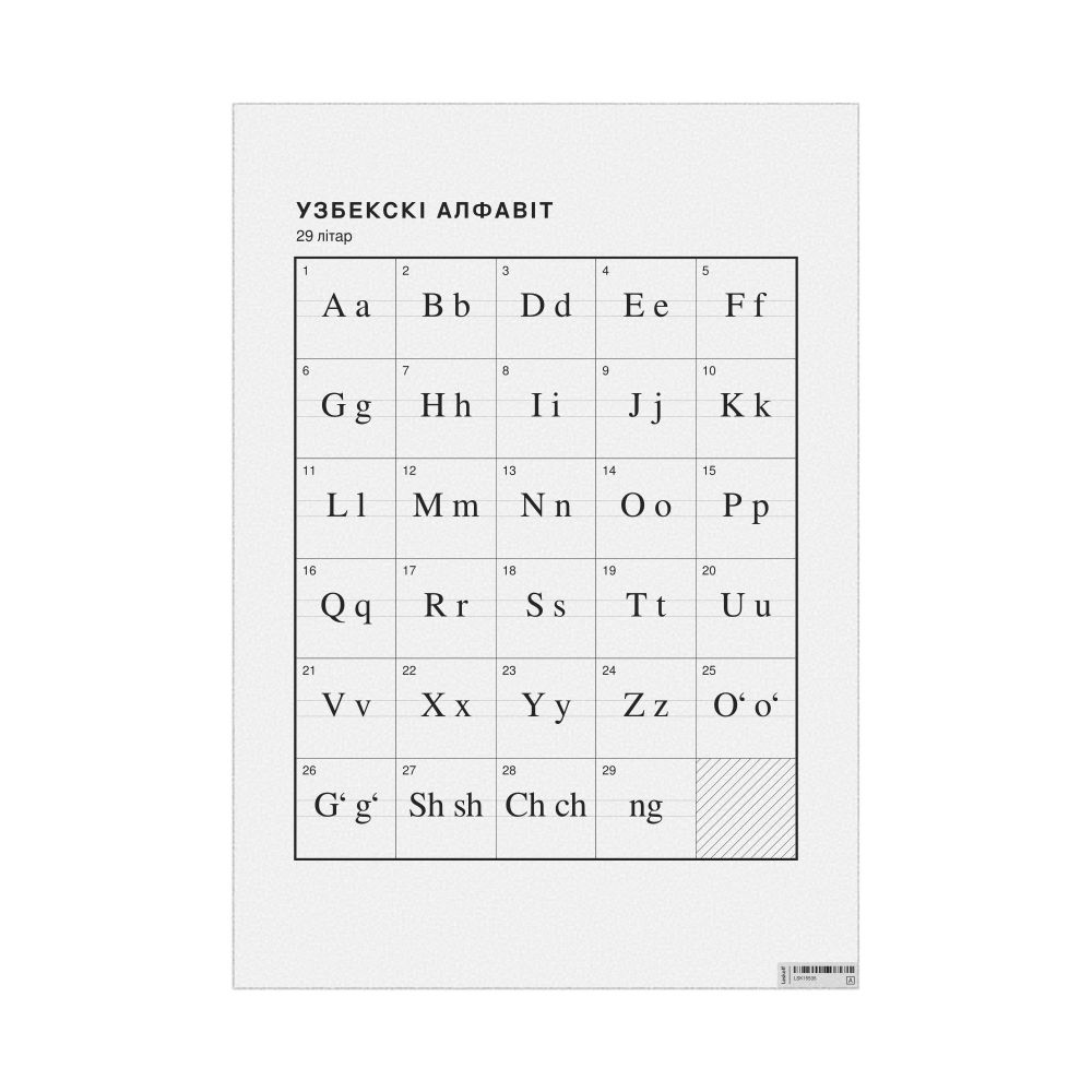 Uzbek Alphabet Chart, 8.3 x 11.7 in (21.0 x 29.7 cm, Desk Chart, Laminated), Belarusian-Labeled