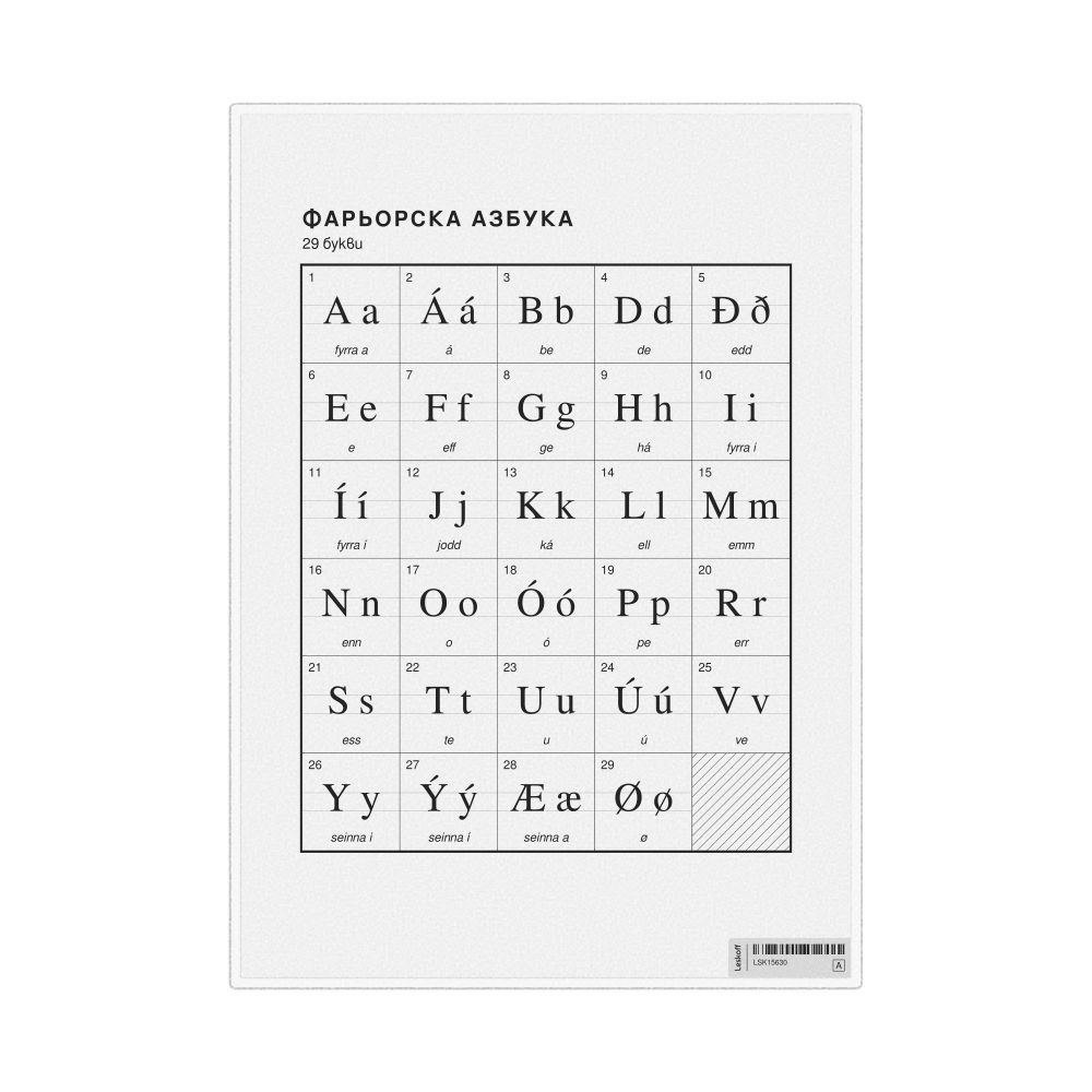 The Faroese alphabet chart (the full set of letters) labeled in Bulgarian (Фарьорска азбука) in the 8.3 x 11.7 in (21.0 x 29.7 cm, desk chart, laminated) format.