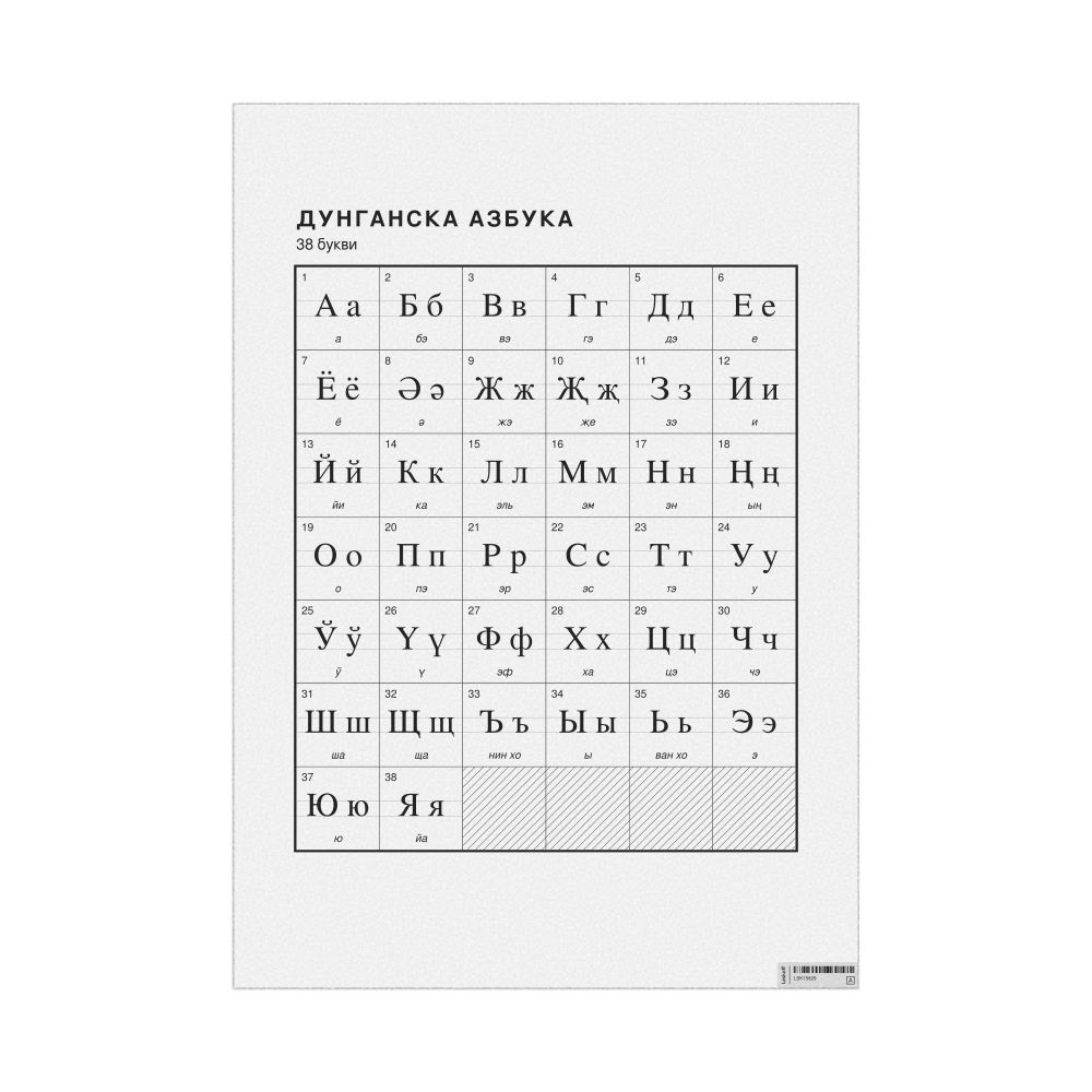 The Dungan alphabet chart (the full set of letters) labeled in Macedonian (Дунганска азбука) in the 23.4 x 33.1 in (59.4 x 84.1 cm, poster / wall chart) format.