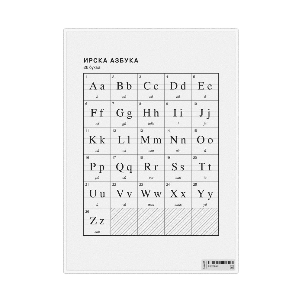 The Irish alphabet chart (the full set of letters) labeled in Macedonian (Ирска азбука) in the 8.3 x 11.7 in (21.0 x 29.7 cm, desk chart, laminated) format.