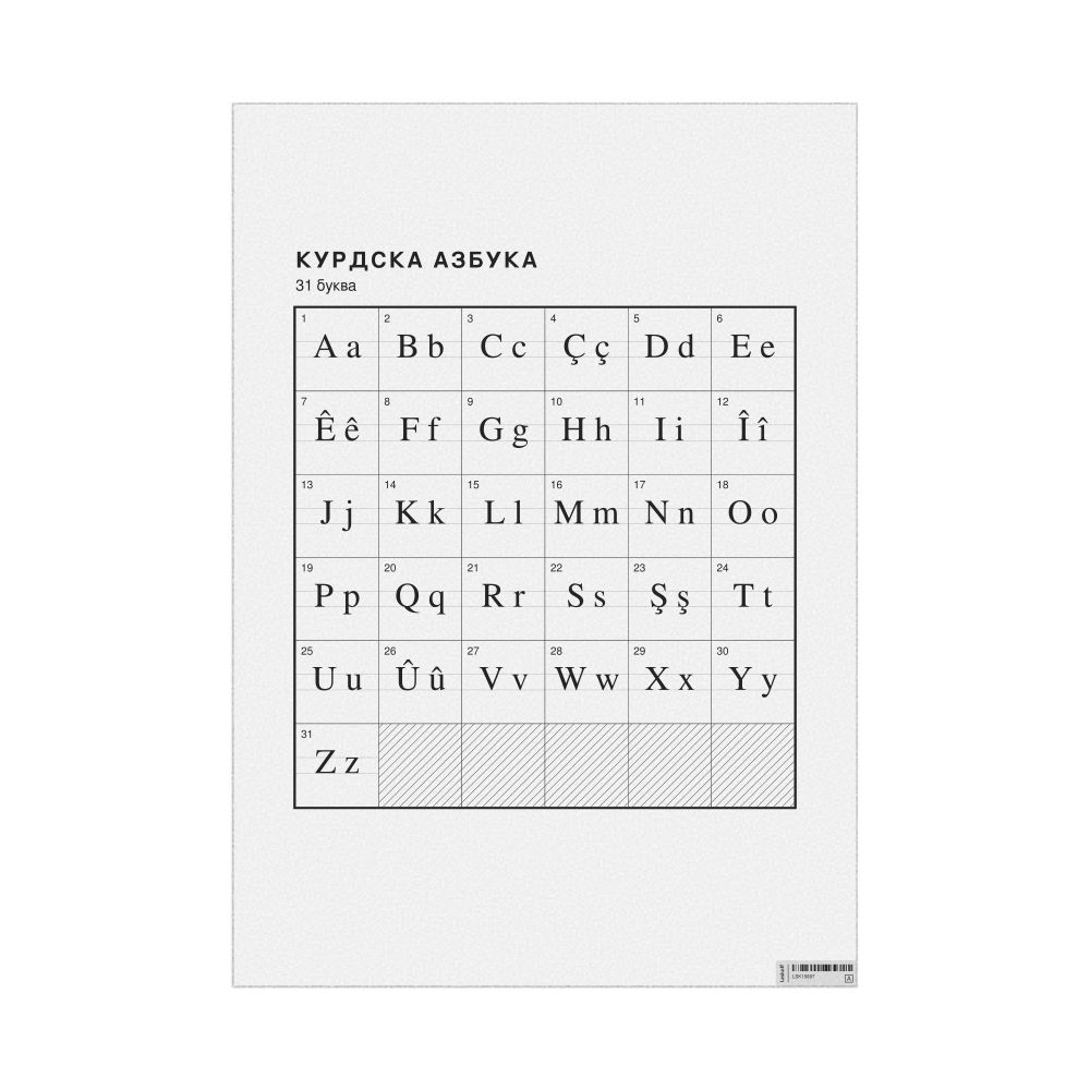 The Kurdish alphabet chart (the full set of letters) labeled in Macedonian (Курдска азбука) in the 23.4 x 33.1 in (59.4 x 84.1 cm, poster / wall chart) format.