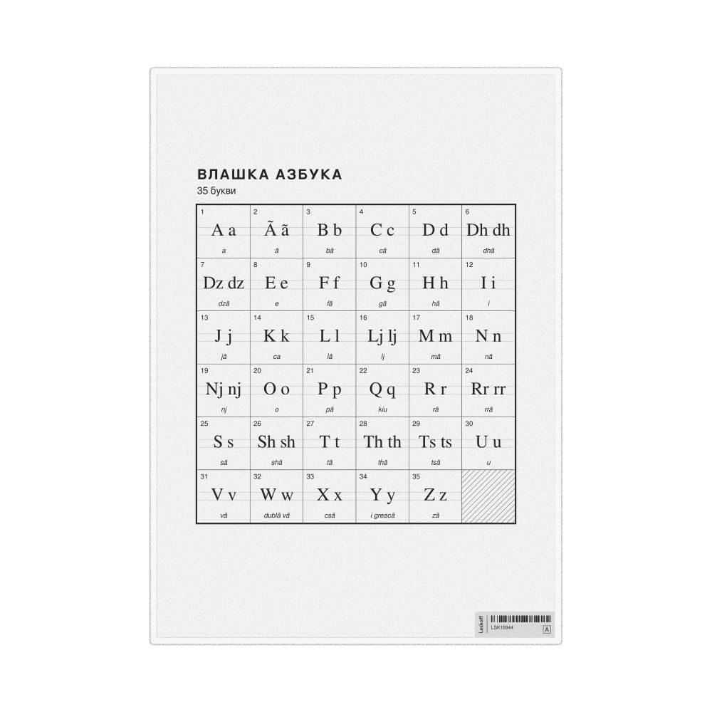 The Aromanian alphabet chart (the full set of letters) labeled in Macedonian (Влашка азбука) in the 8.3 x 11.7 in (21.0 x 29.7 cm, desk chart, laminated) format.