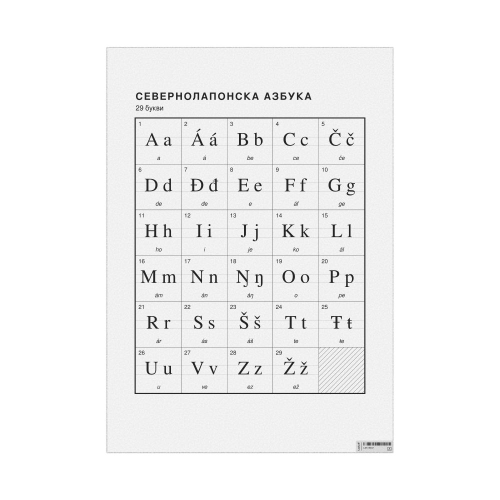 - Linguists and philologists - For both professionals and hobbyists, this alphabet print serves as a piece of linguistic art that presents the character inventory of Northern Sámi as a linguistic (graphemic) dataset. Add this to your Northern Sámi collection to complement your studies and research. A mixture of Northern Sámi letters and Macedonian metatext makes it a unique, visually intriguing illustration of linguistic diversity and interaction.