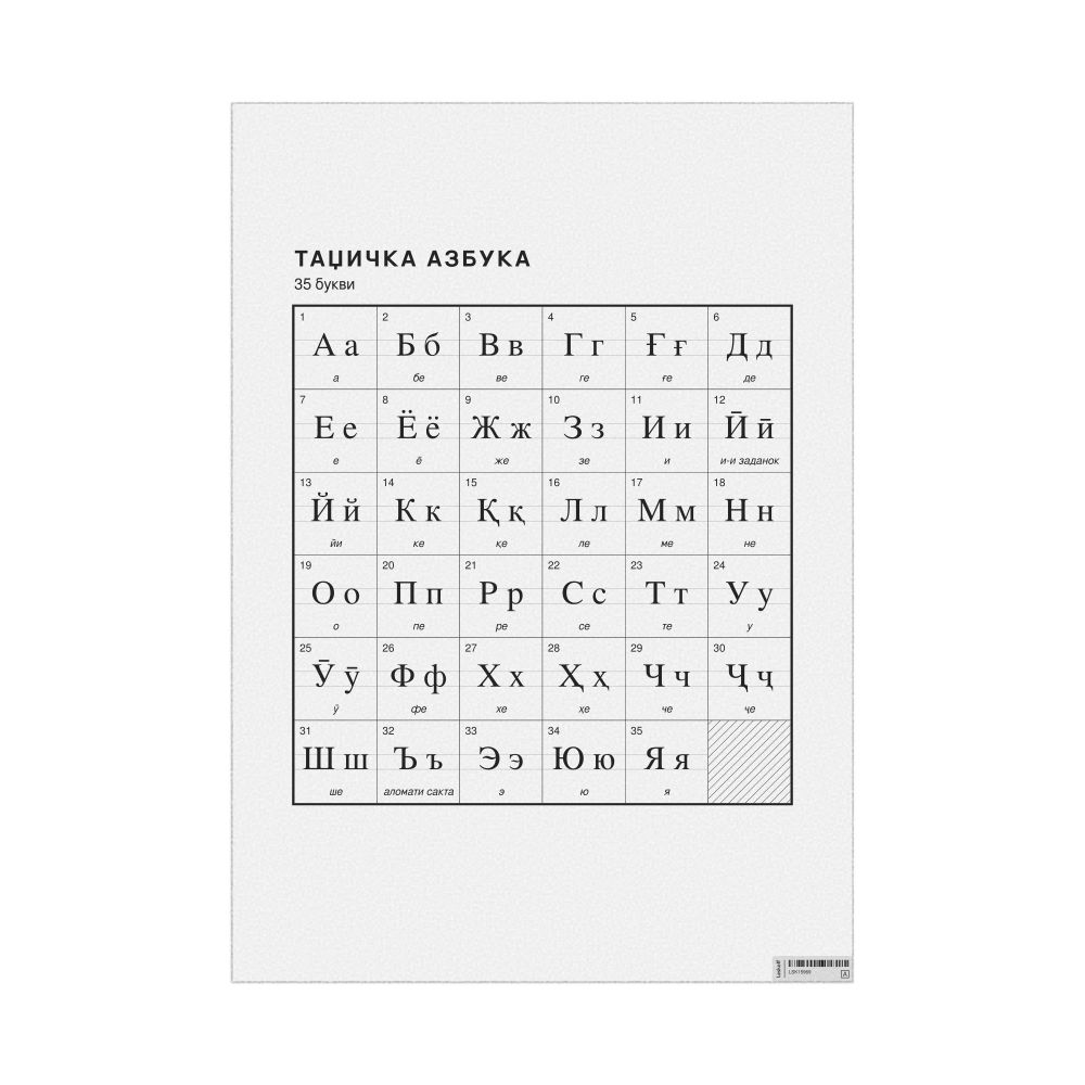 The Tajik alphabet chart (the full set of letters) labeled in Macedonian (Таџичка азбука) in the 23.4 x 33.1 in (59.4 x 84.1 cm, poster / wall chart) format.