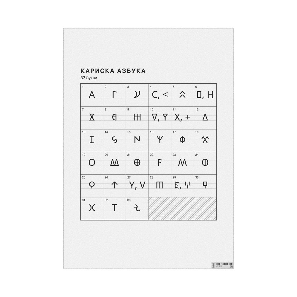 The Carian alphabet chart (the full set of letters) labeled in Macedonian (Кариска азбука) in the 23.4 x 33.1 in (59.4 x 84.1 cm, poster / wall chart) format.