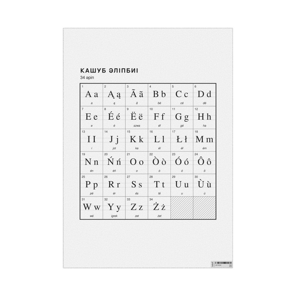 The Kashubian alphabet chart (the full set of letters) labeled in Kazakh (Кашуб әліпбиі) in the 23.4 x 33.1 in (59.4 x 84.1 cm, poster / wall chart) format.
