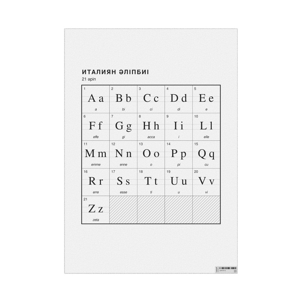 The Italian alphabet chart (the full set of letters) labeled in Kazakh (Италиян әліпбиі) in the 23.4 x 33.1 in (59.4 x 84.1 cm, poster / wall chart) format.