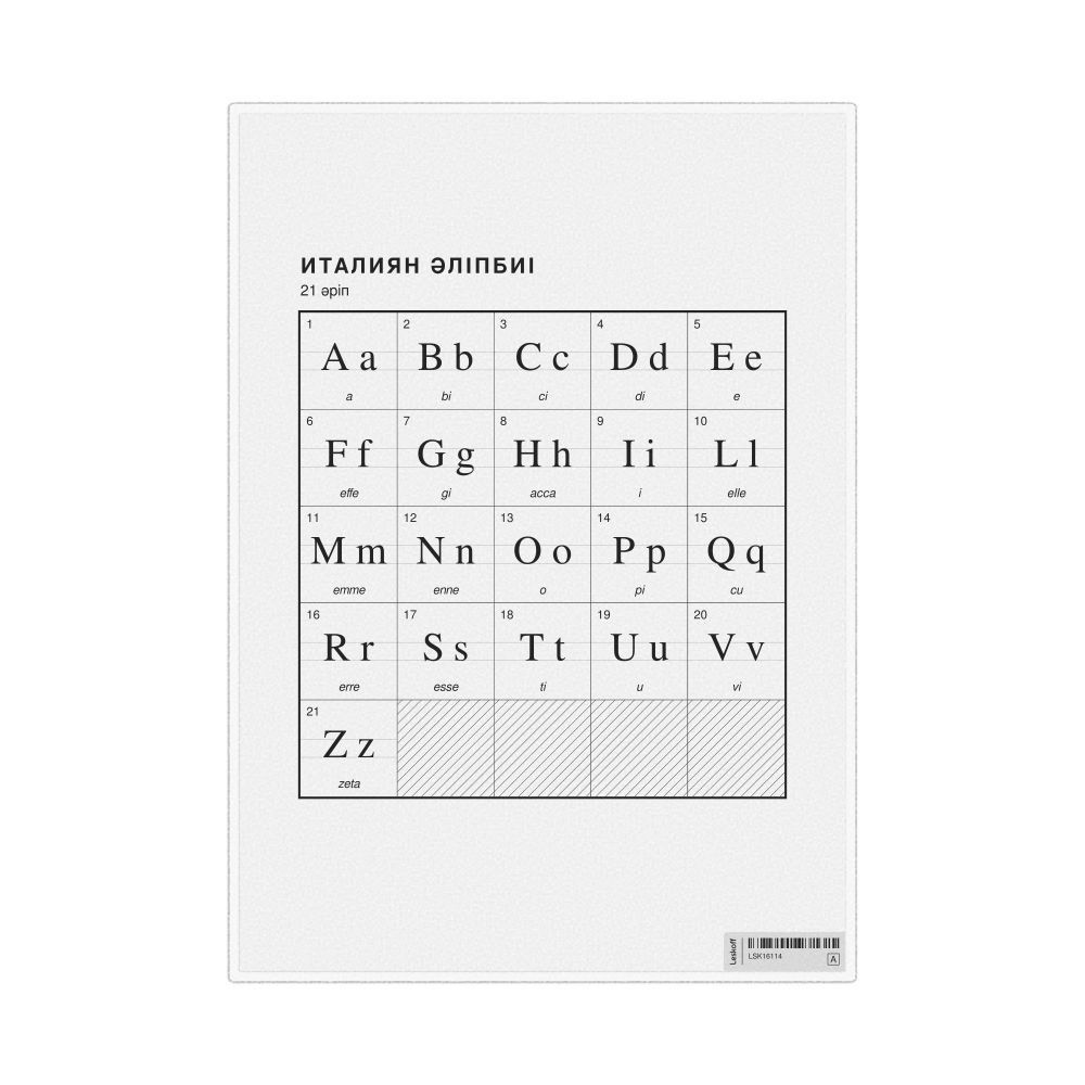 The Italian alphabet chart (the full set of letters) labeled in Kazakh (Италиян әліпбиі) in the 8.3 x 11.7 in (21.0 x 29.7 cm, desk chart, laminated) format.