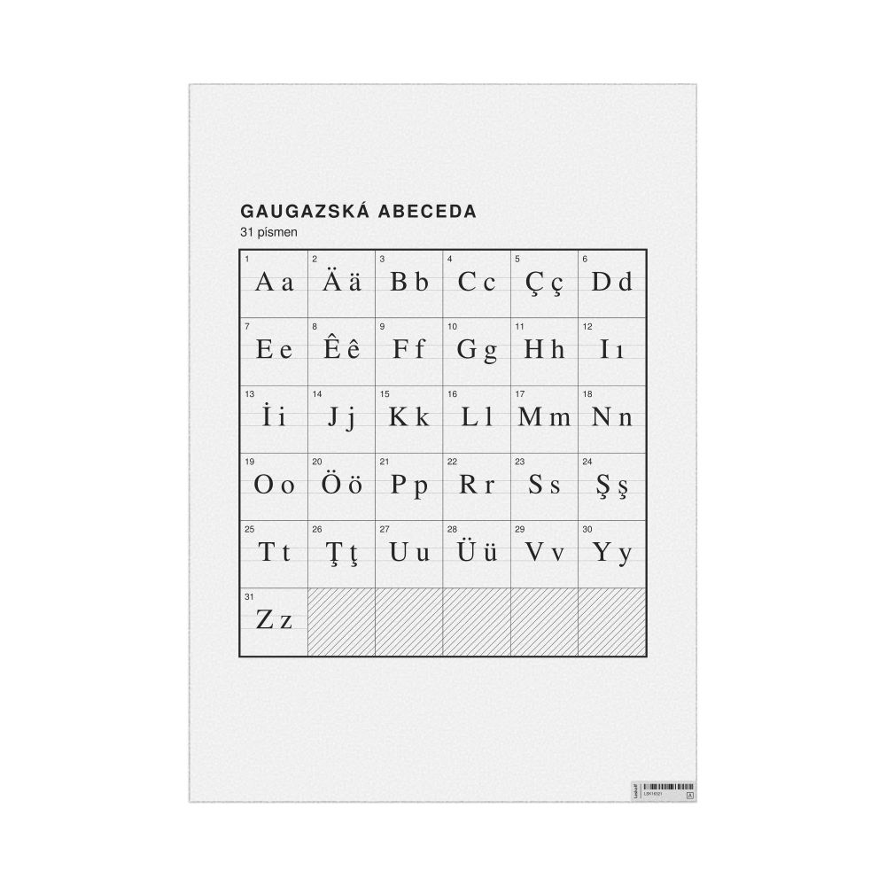 - Linguists and philologists - For both professionals and hobbyists, this alphabet print serves as a piece of linguistic art that presents the character inventory of Gagauz as a linguistic (graphemic) dataset. Add this to your Gagauz collection to complement your studies and research. A mixture of Gagauz letters and Czech metatext makes it a unique, visually intriguing illustration of linguistic diversity and interaction.