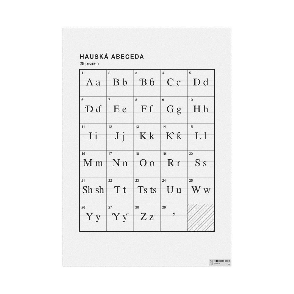 • Linguists and philologists - For both professionals and hobbyists, this alphabet print serves as a piece of linguistic art that presents the character inventory of Hausa as a linguistic (graphemic) dataset. Add this to your Hausa collection to complement your studies and research. A mixture of Hausa letters and Czech metatext makes it a unique, visually intriguing illustration of linguistic diversity and interaction.