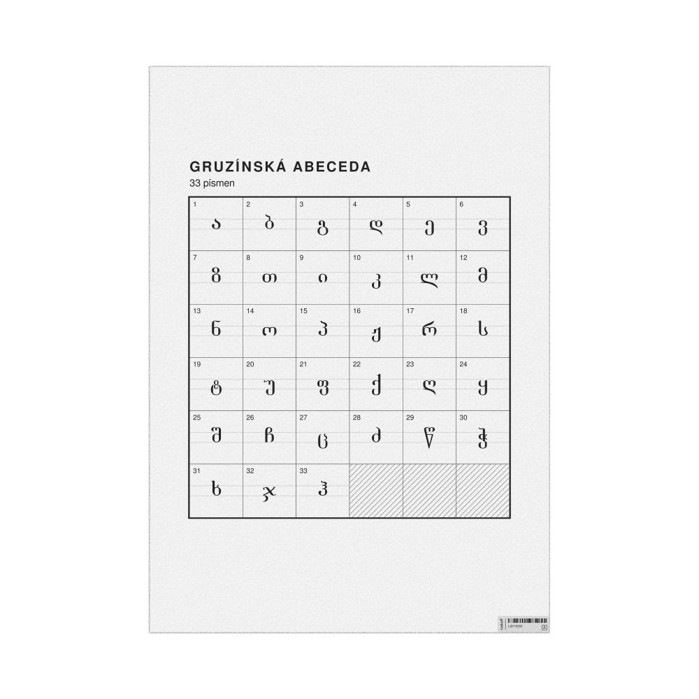 - Linguists and philologists - For both professionals and hobbyists, this alphabet print serves as a piece of linguistic art that presents the character inventory of Georgian as a linguistic (graphemic) dataset. Add this to your Georgian collection to complement your studies and research. A mixture of Georgian letters and Czech metatext makes it a unique, visually intriguing illustration of linguistic diversity and interaction.