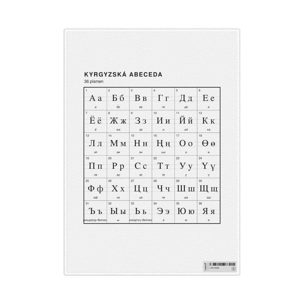 Kyrgyz Alphabet Chart, 23.4 x 33.1 in (59.4 x 84.1 cm, Poster / Wall Chart), Czech-Labeled
