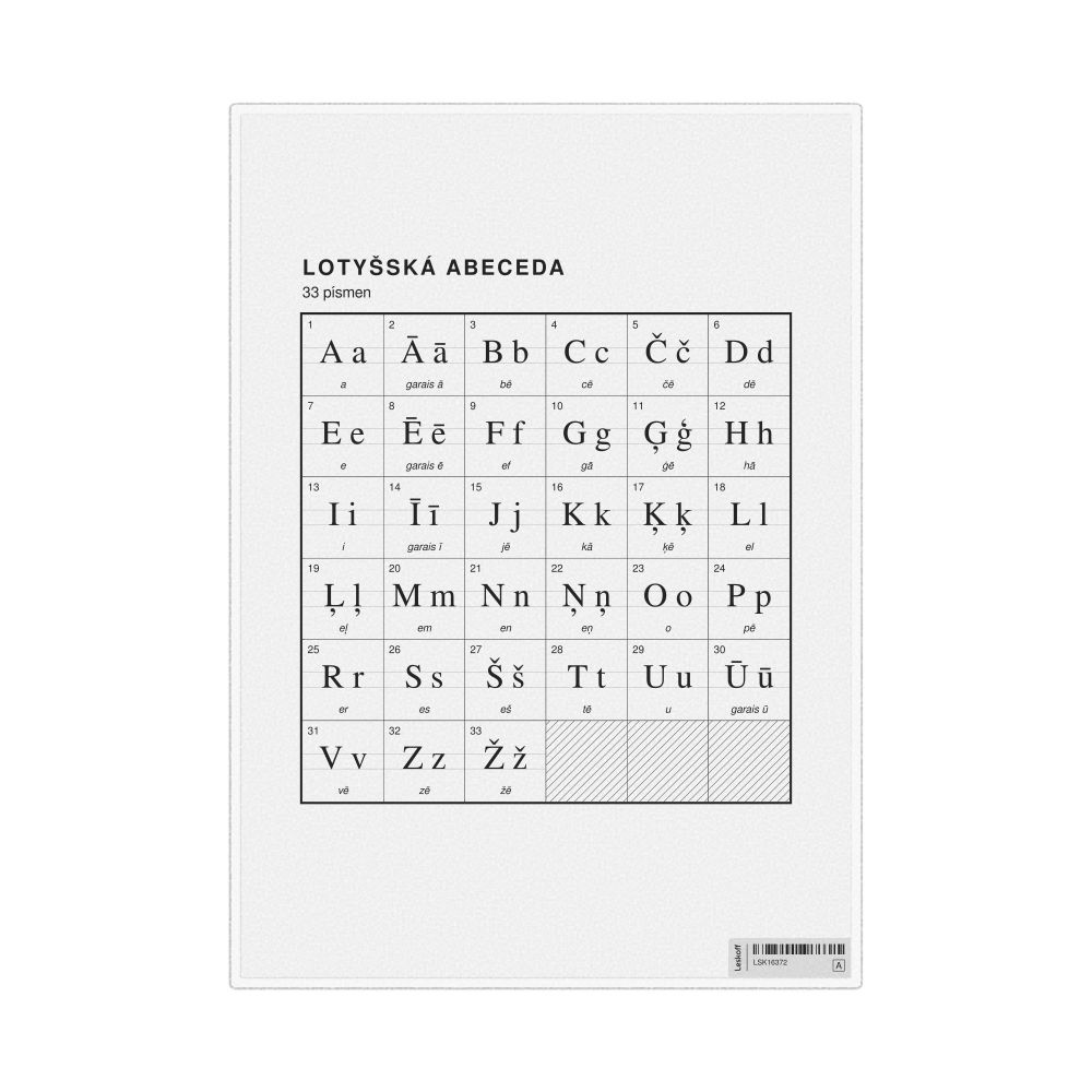 - Linguists and philologists - For both professionals and hobbyists, this alphabet print serves as a piece of linguistic art that presents the character inventory of Latvian as a linguistic (graphemic) dataset. Add this to your Latvian collection to complement your studies and research. A mixture of Latvian letters and Czech metatext makes it a unique, visually intriguing illustration of linguistic diversity and interaction.