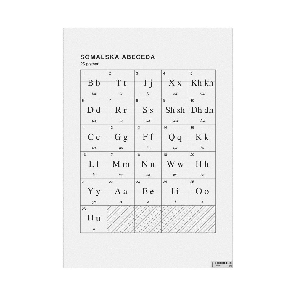 - Linguists and philologists - For both professionals and hobbyists, this alphabet print serves as a piece of linguistic art that presents the character inventory of Somali as a linguistic (graphemic) dataset. Add this to your Somali collection to complement your studies and research. A mixture of Somali letters and Czech metatext makes it a unique, visually intriguing illustration of linguistic diversity and interaction.