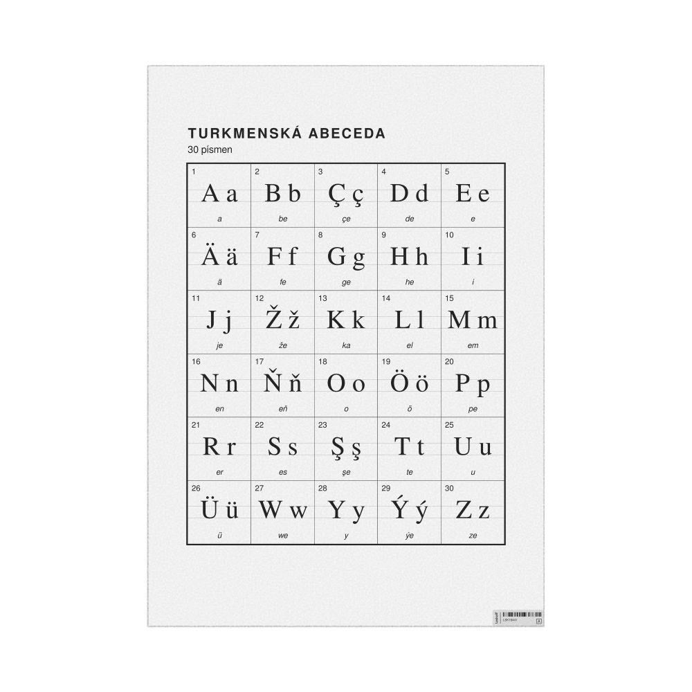 - Linguists and philologists - For both professionals and hobbyists, this alphabet print serves as a piece of linguistic art that presents the character inventory of Turkmen as a linguistic (graphemic) dataset. Add this to your Turkmen collection to complement your studies and research. A mixture of Turkmen letters and Czech metatext makes it a unique, visually intriguing illustration of linguistic diversity and interaction.