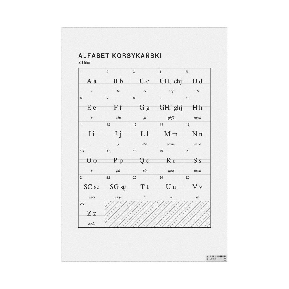 The Corsican alphabet chart (the full set of letters) labeled in Polish (Alfabet korsykański) in the 23.4 x 33.1 in (59.4 x 84.1 cm, poster / wall chart) format.