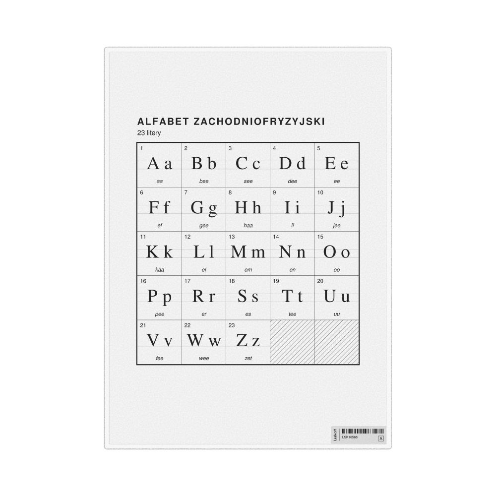 The West Frisian alphabet chart (the full set of letters) labeled in Polish (Alfabet zachodniofryzyjski) in the 8.3 x 11.7 in (21.0 x 29.7 cm, desk chart, laminated) format.