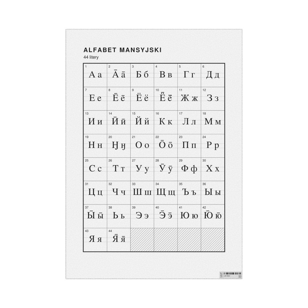 - Linguists and philologists - For both professionals and hobbyists, this alphabet print serves as a piece of linguistic art that presents the character inventory of Mansi as a linguistic (graphemic) dataset. Add this to your Mansi collection to complement your studies and research. A mixture of Mansi letters and Polish metatext makes it a unique, visually intriguing illustration of linguistic diversity and interaction.