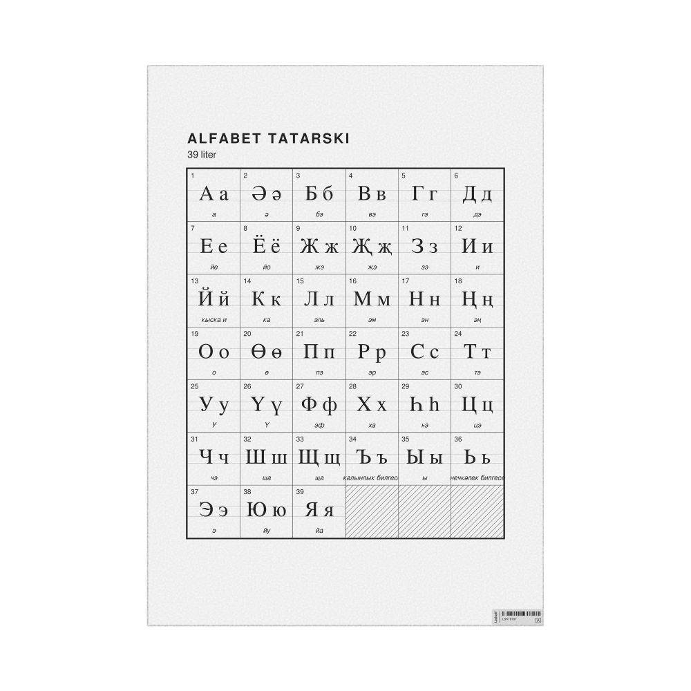 - Linguists and philologists - For both professionals and hobbyists, this alphabet print serves as a piece of linguistic art that presents the character inventory of Tatar as a linguistic (graphemic) dataset. Add this to your Tatar collection to complement your studies and research. A mixture of Tatar letters and Polish metatext makes it a unique, visually intriguing illustration of linguistic diversity and interaction.