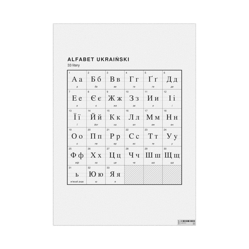 The Ukrainian alphabet chart (the full set of letters) labeled in Polish (Alfabet ukraiński) in the 23.4 x 33.1 in (59.4 x 84.1 cm, poster / wall chart) format.