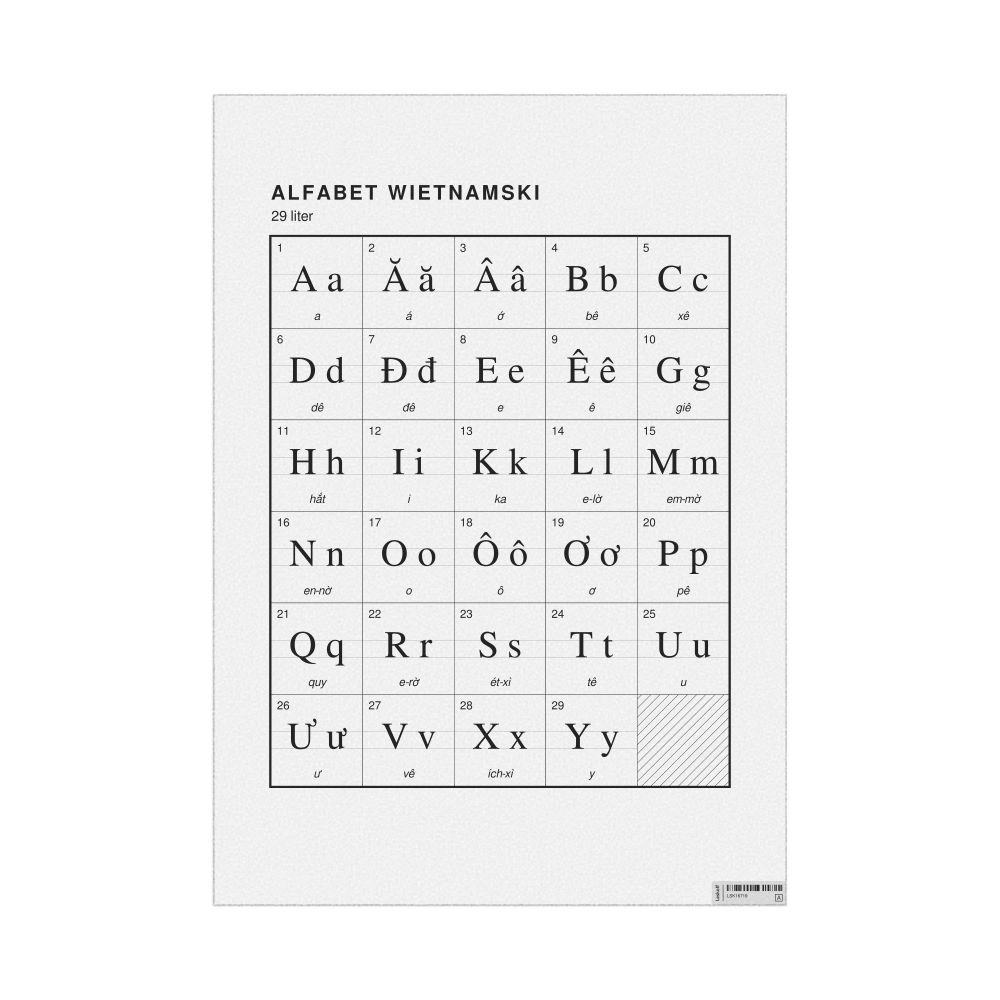 The Vietnamese alphabet chart (the full set of letters) labeled in Polish (Alfabet wietnamski) in the 23.4 x 33.1 in (59.4 x 84.1 cm, poster / wall chart) format.