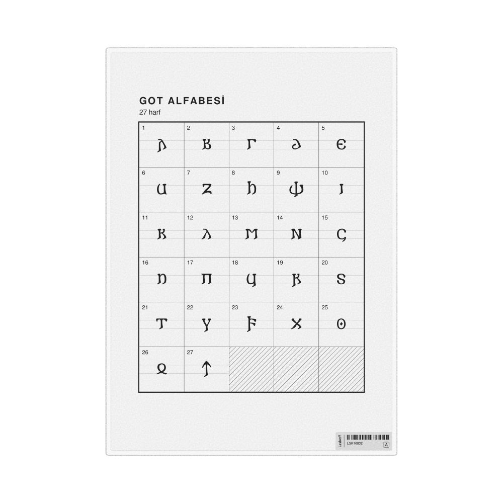 The Gothic alphabet chart (the full set of letters) labeled in Turkish (Got alfabesi) in the 8.3 x 11.7 in (21.0 x 29.7 cm, desk chart, laminated) format.
