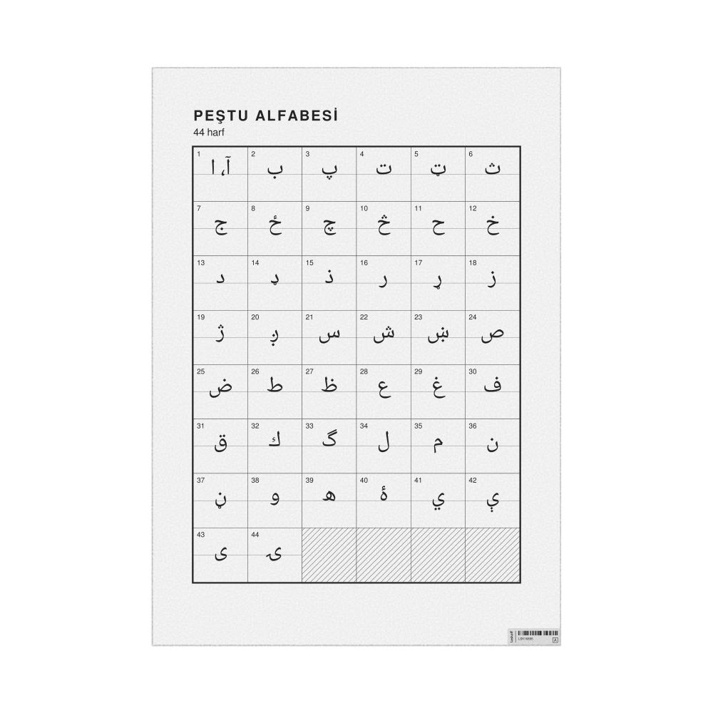 The Pashto alphabet chart (the full set of letters) labeled in Turkish (Peştu alfabesi) in the 23.4 x 33.1 in (59.4 x 84.1 cm, poster / wall chart) format.