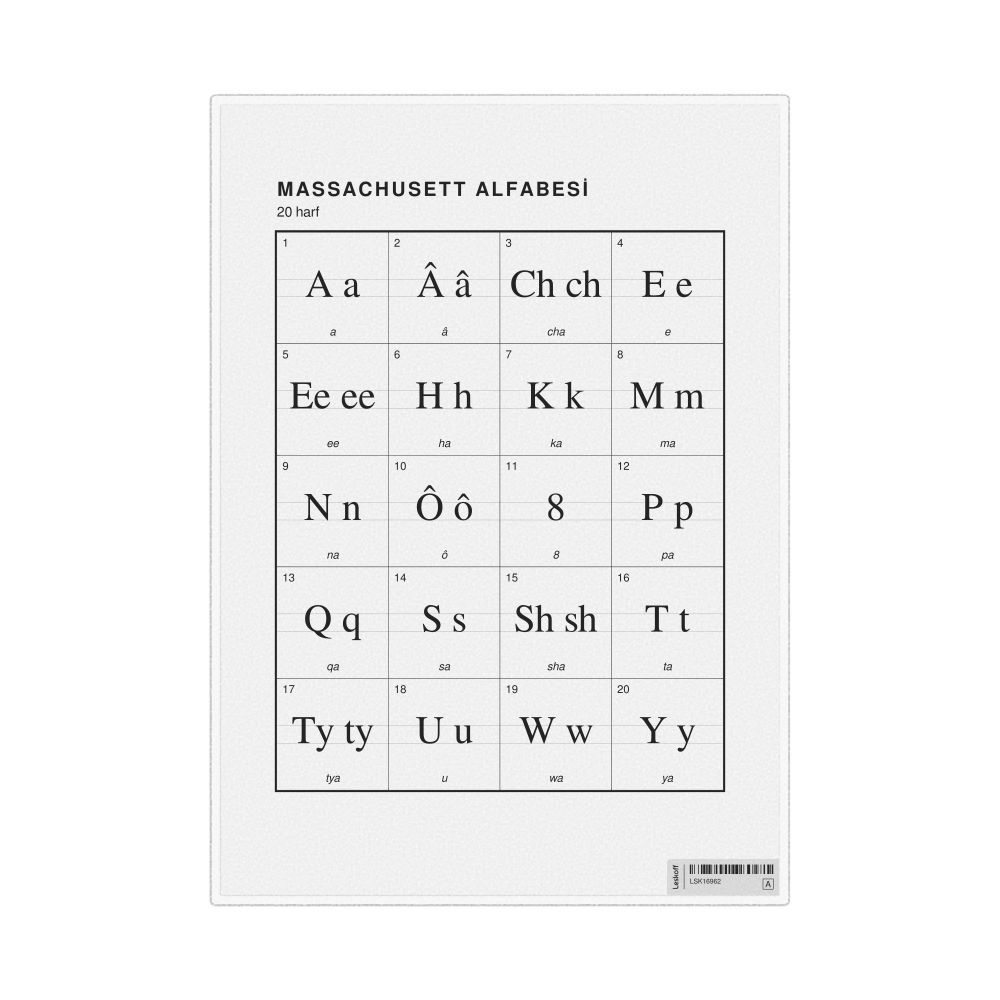 The Massachusett alphabet chart (the full set of letters) labeled in Turkish (Massachusett alfabesi) in the 8.3 x 11.7 in (21.0 x 29.7 cm, desk chart, laminated) format.