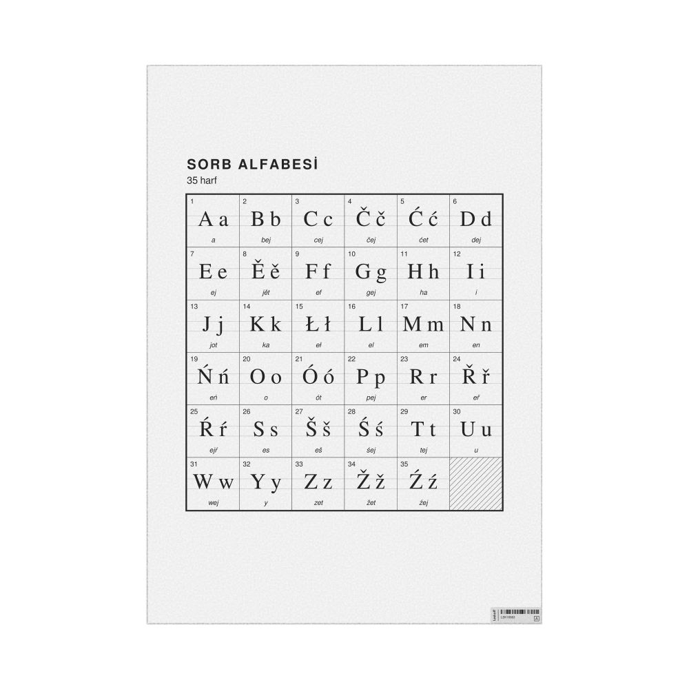 The Sorbian alphabet chart (the full set of letters) labeled in Turkish (Sorb alfabesi) in the 23.4 x 33.1 in (59.4 x 84.1 cm, poster / wall chart) format.