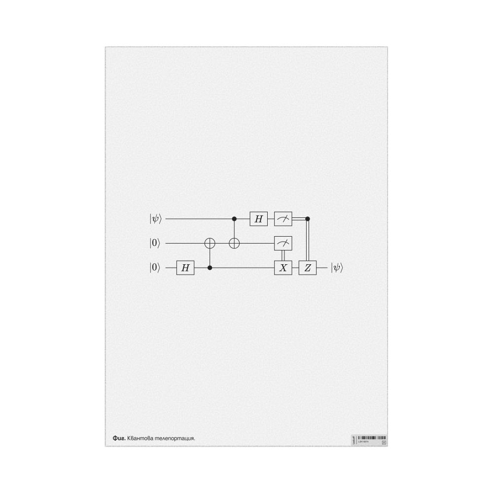 A poster featuring the quantum teleportation circuit diagram in Bulgarian (Квантова телепортация).