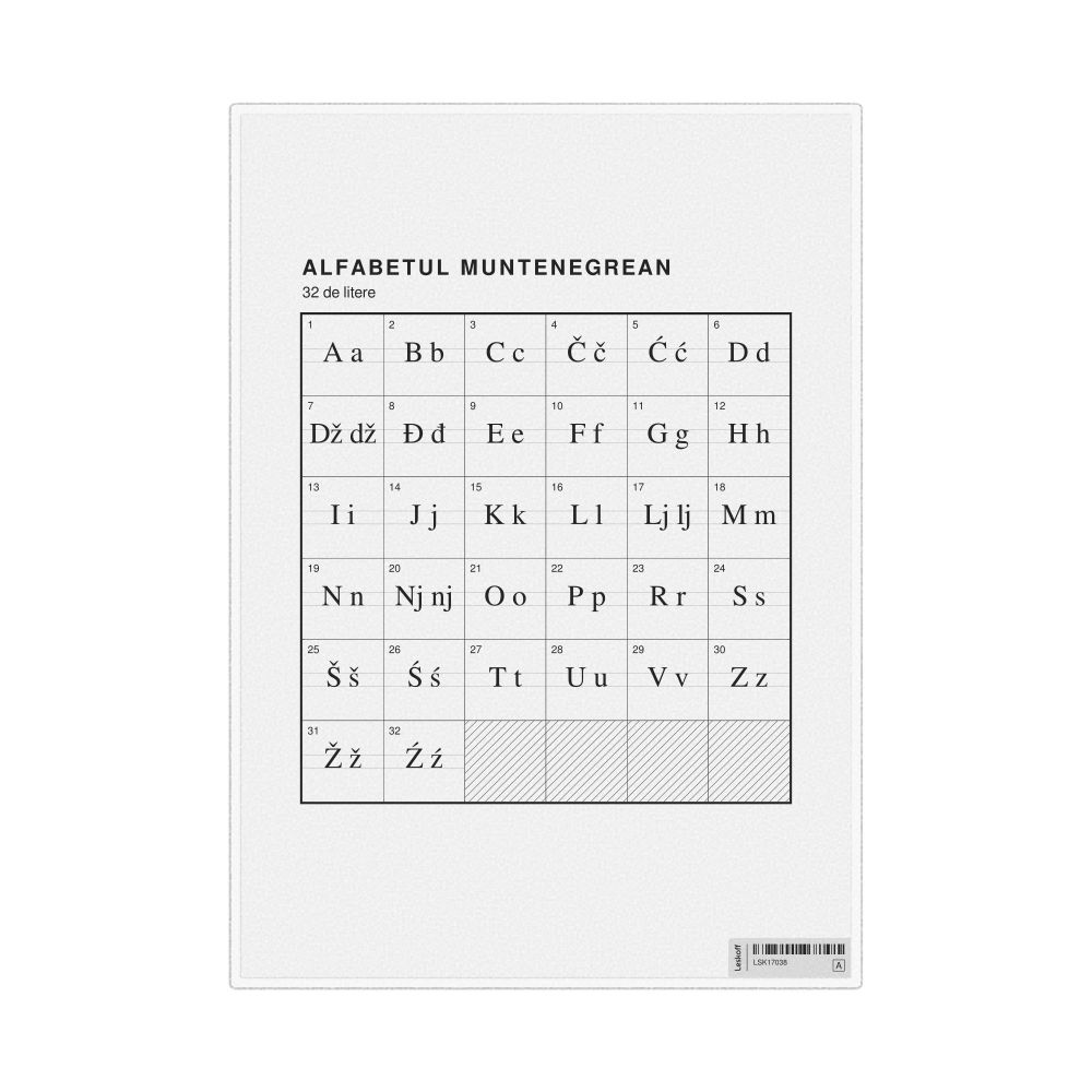 Montenegrin Alphabet Chart8.3 x 11.7 in (21.0 x 29.7 cm, Desk Chart, Laminated), Romanian-Labeled