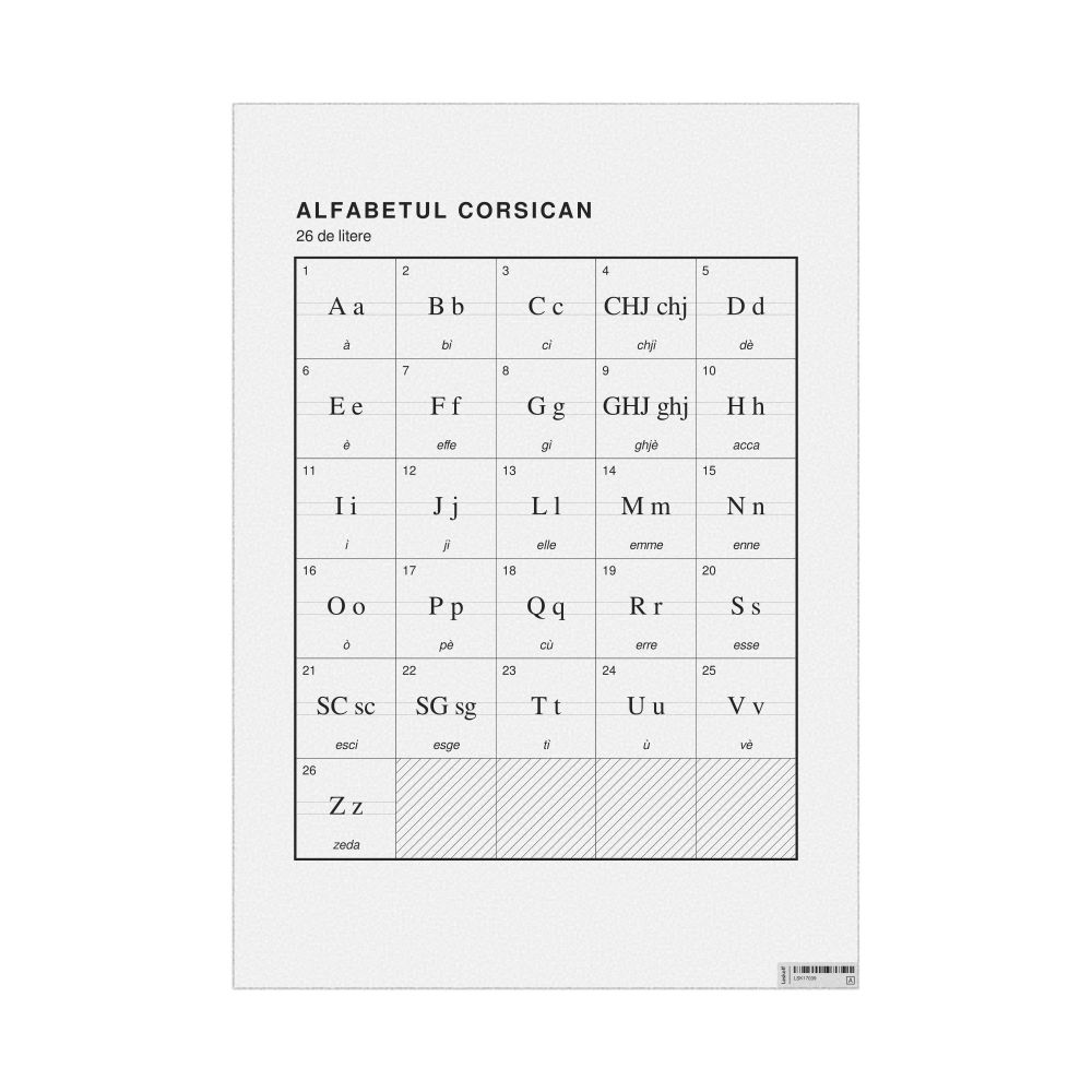 The Corsican alphabet chart (the full set of letters) labeled in Romanian (Alfabetul corsican) in the 23.4 x 33.1 in (59.4 x 84.1 cm, poster / wall chart) format.
