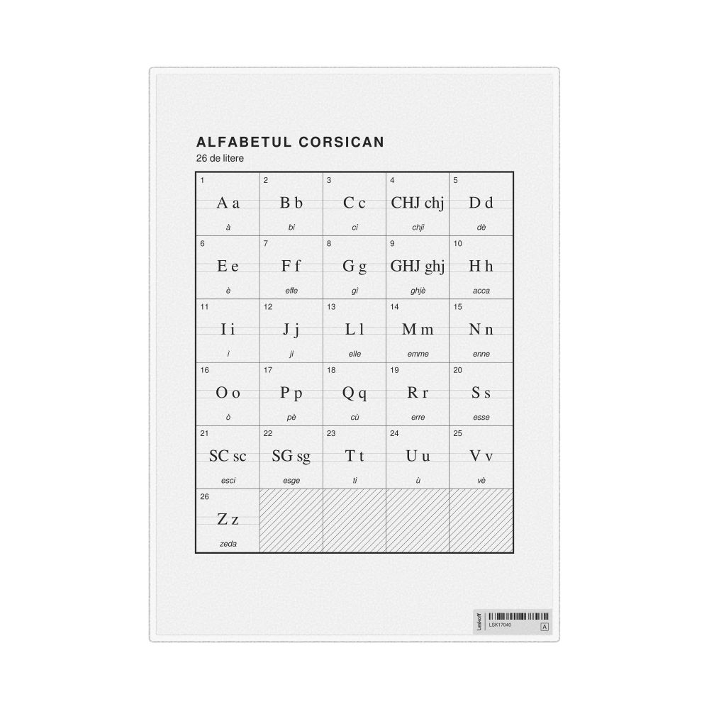 The Corsican alphabet chart (the full set of letters) labeled in Romanian (Alfabetul corsican) in the 8.3 x 11.7 in (21.0 x 29.7 cm, desk chart, laminated) format.