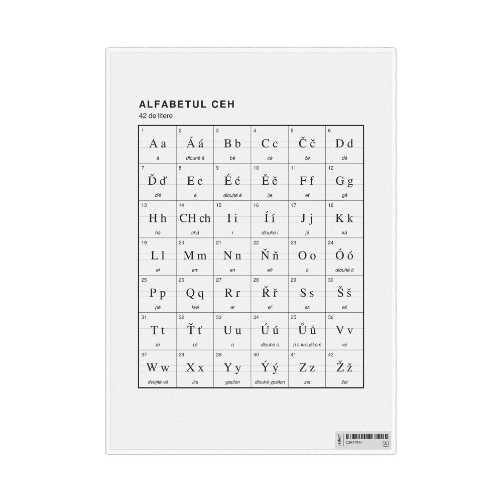 The Czech alphabet chart (the full set of letters) labeled in Romanian (Alfabetul ceh) in the 8.3 x 11.7 in (21.0 x 29.7 cm, desk chart, laminated) format.