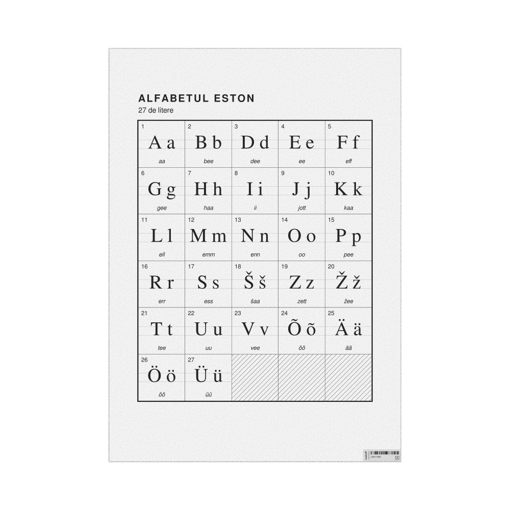 The Estonian alphabet chart (the full set of letters) labeled in Romanian (Alfabetul eston) in the 23.4 x 33.1 in (59.4 x 84.1 cm, poster / wall chart) format.