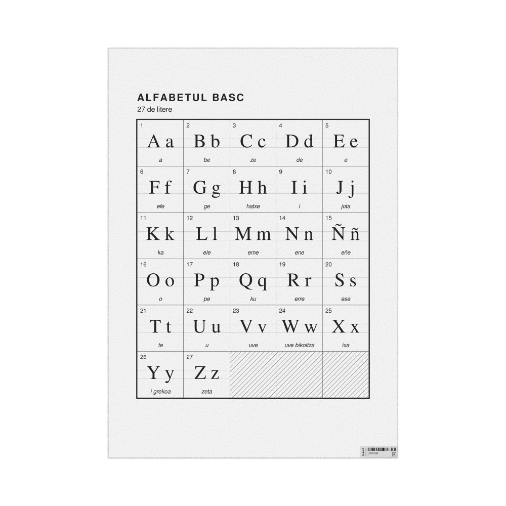 The Basque alphabet chart (the full set of letters) labeled in Romanian (Alfabetul basc) in the 23.4 x 33.1 in (59.4 x 84.1 cm, poster / wall chart) format.