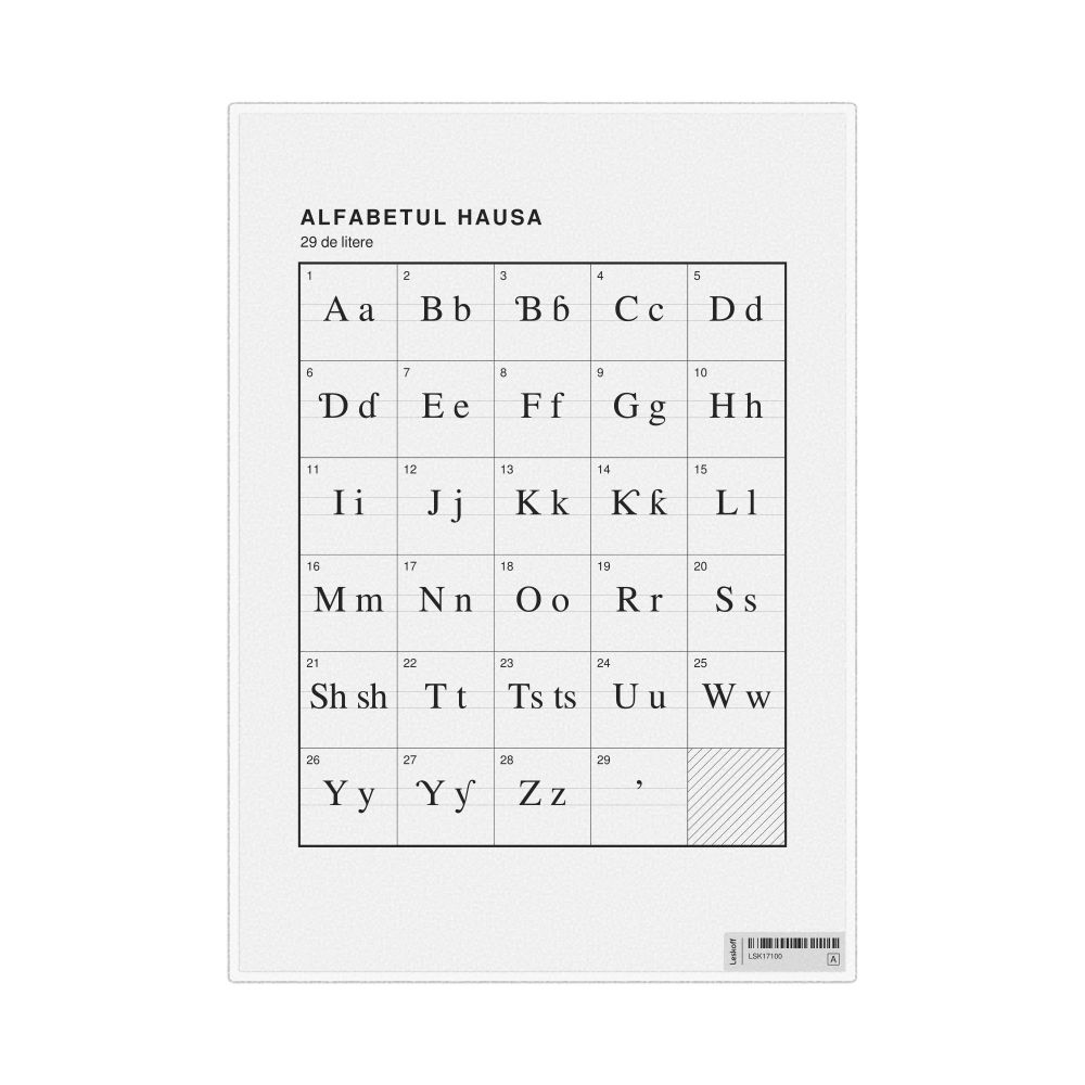 The Hausa alphabet chart (the full set of letters) labeled in Romanian (Alfabetul hausa) in the 8.3 x 11.7 in (21.0 x 29.7 cm, desk chart, laminated) format.