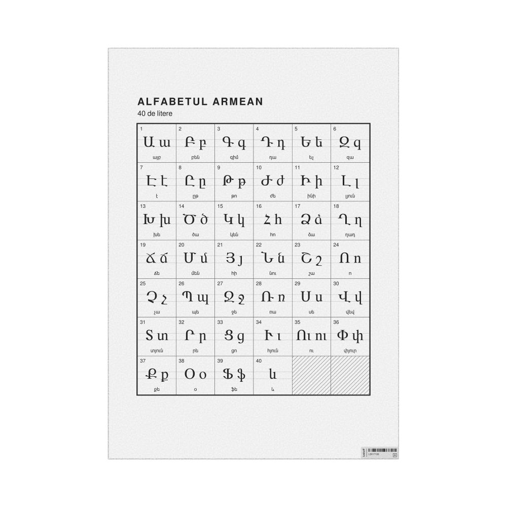 The Armenian alphabet chart (the full set of letters) labeled in Romanian (Alfabetul armean) in the 23.4 x 33.1 in (59.4 x 84.1 cm, poster / wall chart) format.