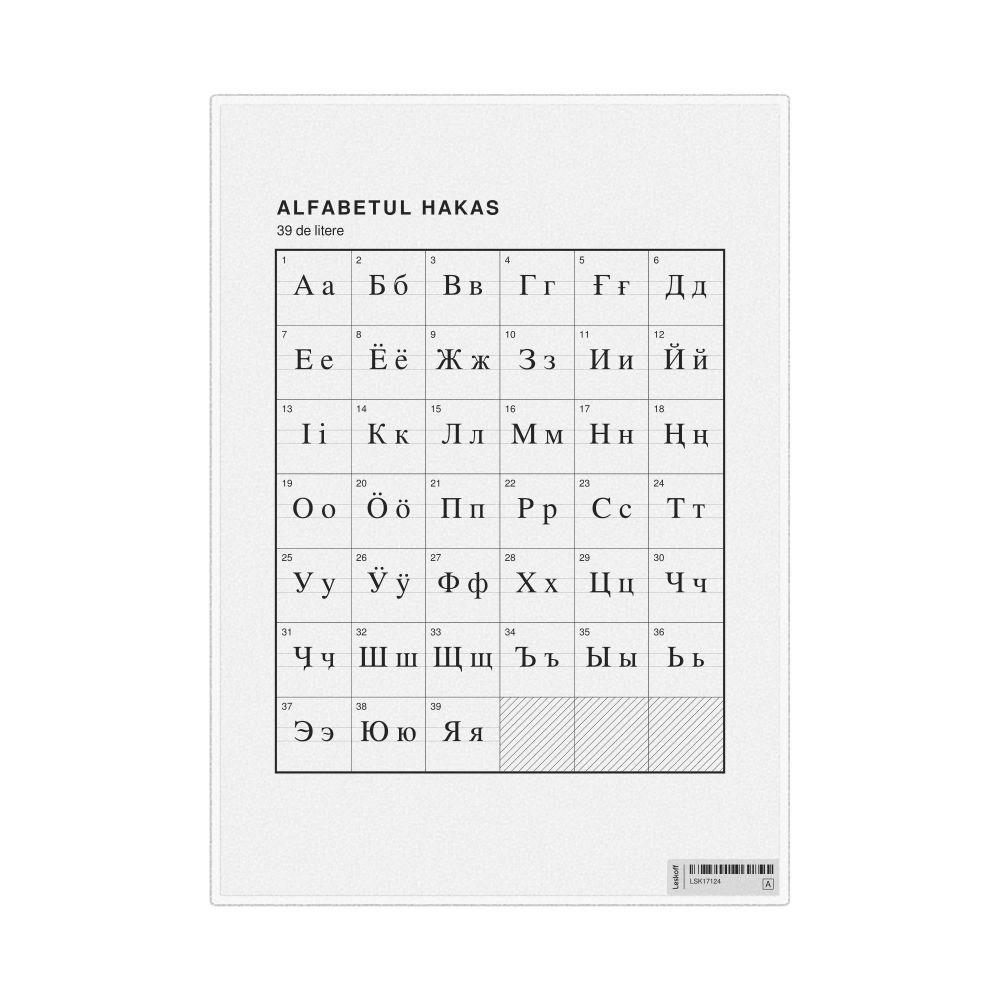 The Khakas alphabet chart (the full set of letters) labeled in Romanian (Alfabetul hakas) in the 8.3 x 11.7 in (21.0 x 29.7 cm, desk chart, laminated) format.