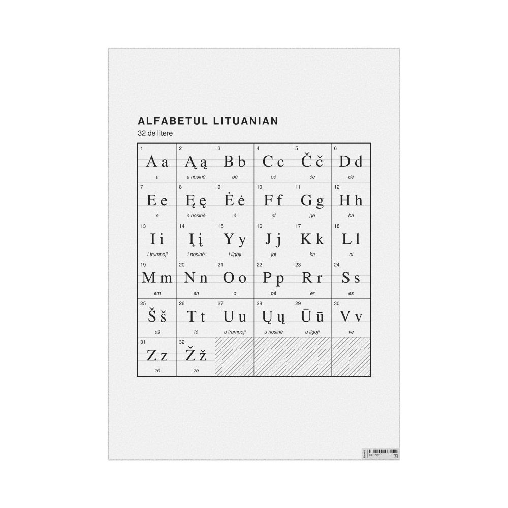 The Lithuanian alphabet chart (the full set of letters) labeled in Romanian (Alfabetul lituanian) in the 23.4 x 33.1 in (59.4 x 84.1 cm, poster / wall chart) format.