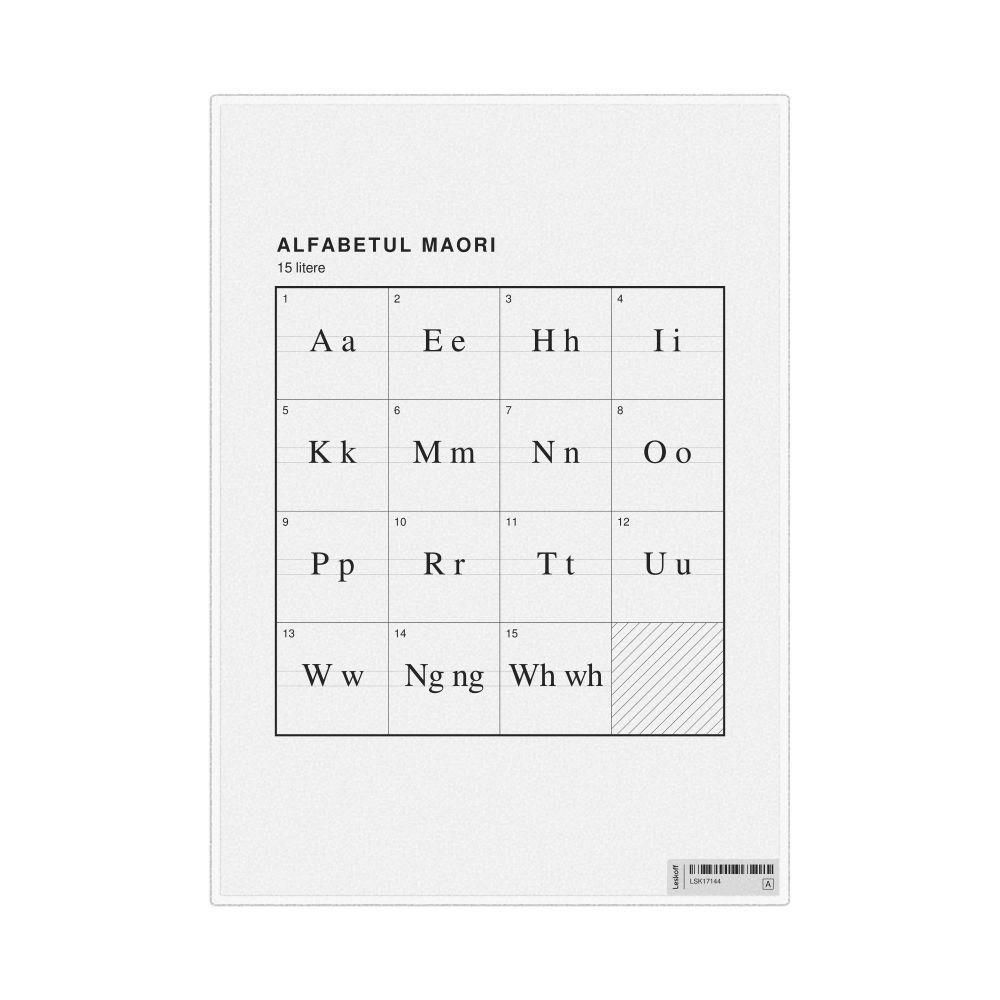 The Māori alphabet chart (the full set of letters) labeled in Romanian (Alfabetul maori) in the 8.3 x 11.7 in (21.0 x 29.7 cm, desk chart, laminated) format.
