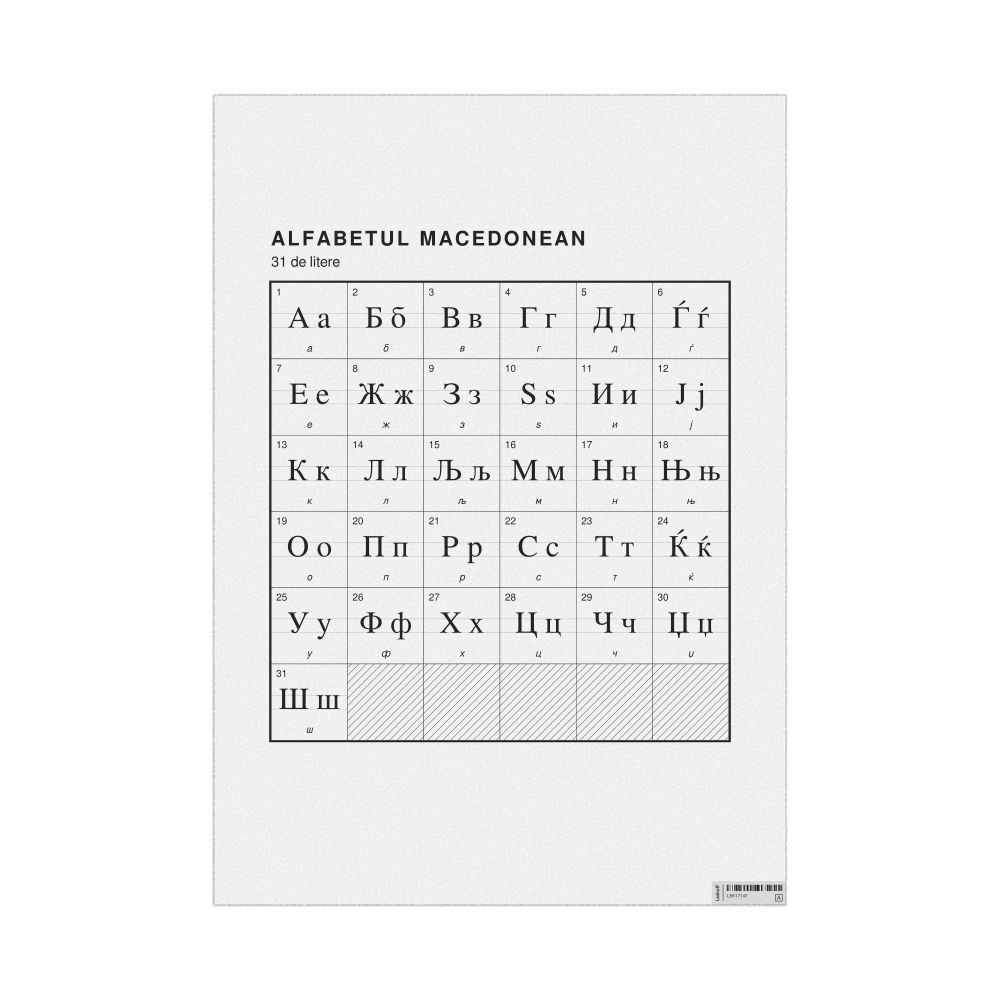 - Linguists and philologists - For both professionals and hobbyists, this alphabet print serves as a piece of linguistic art that presents the character inventory of Macedonian as a linguistic (graphemic) dataset. Add this to your Macedonian collection to complement your studies and research. A mixture of Macedonian letters and Romanian metatext makes it a unique, visually intriguing illustration of linguistic diversity and interaction.