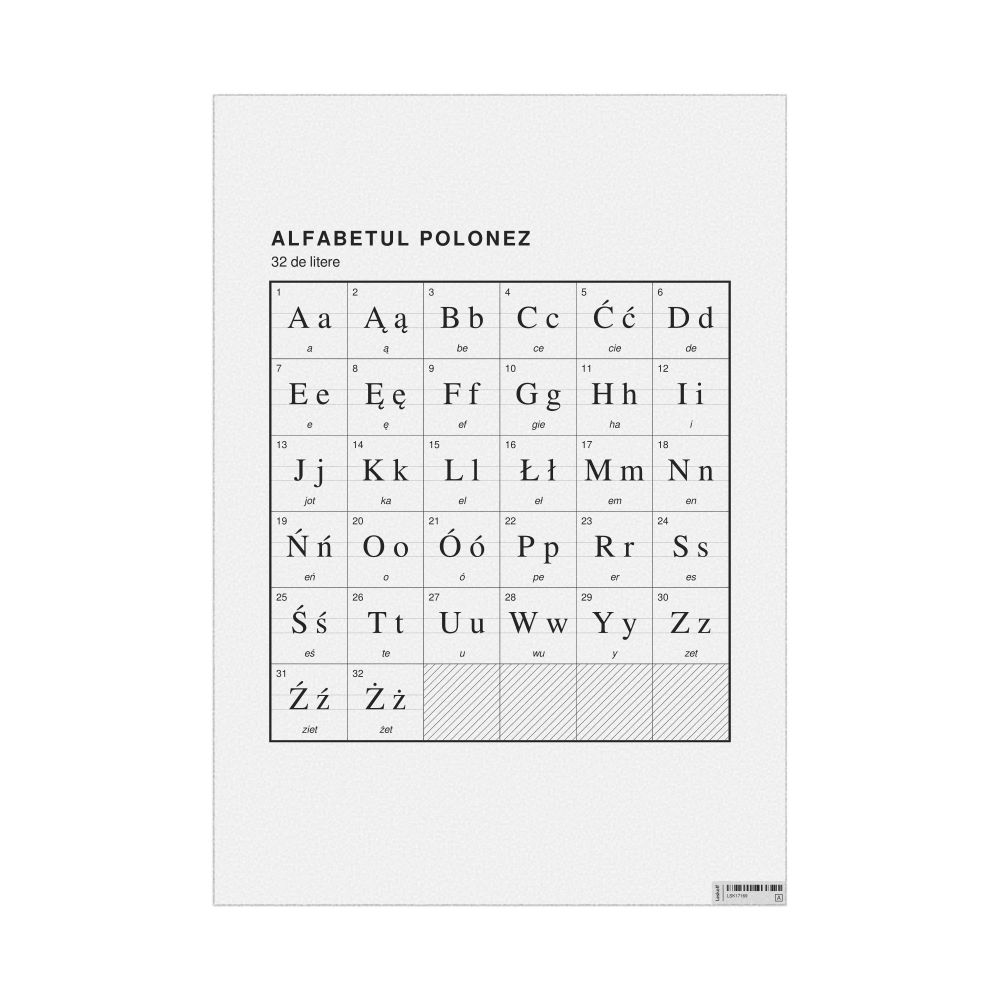 The Polish alphabet chart (the full set of letters) labeled in Romanian (Alfabetul polonez) in the 23.4 x 33.1 in (59.4 x 84.1 cm, poster / wall chart) format.