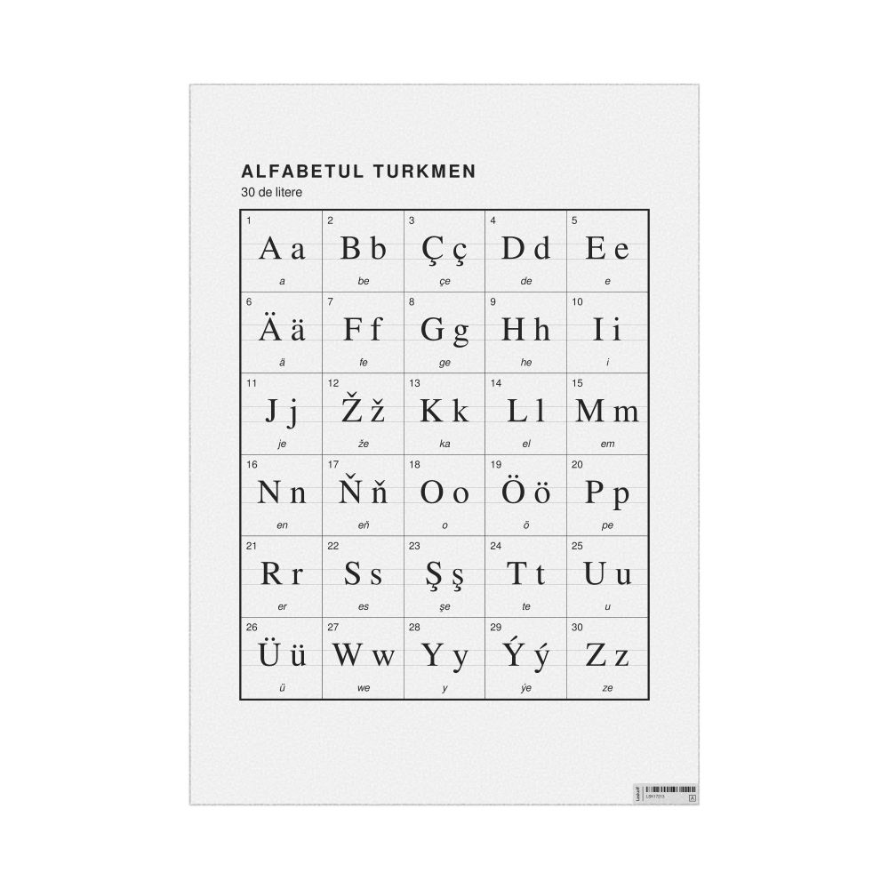 The Turkmen alphabet chart (the full set of letters) labeled in Romanian (Alfabetul turkmen) in the 23.4 x 33.1 in (59.4 x 84.1 cm, poster / wall chart) format.