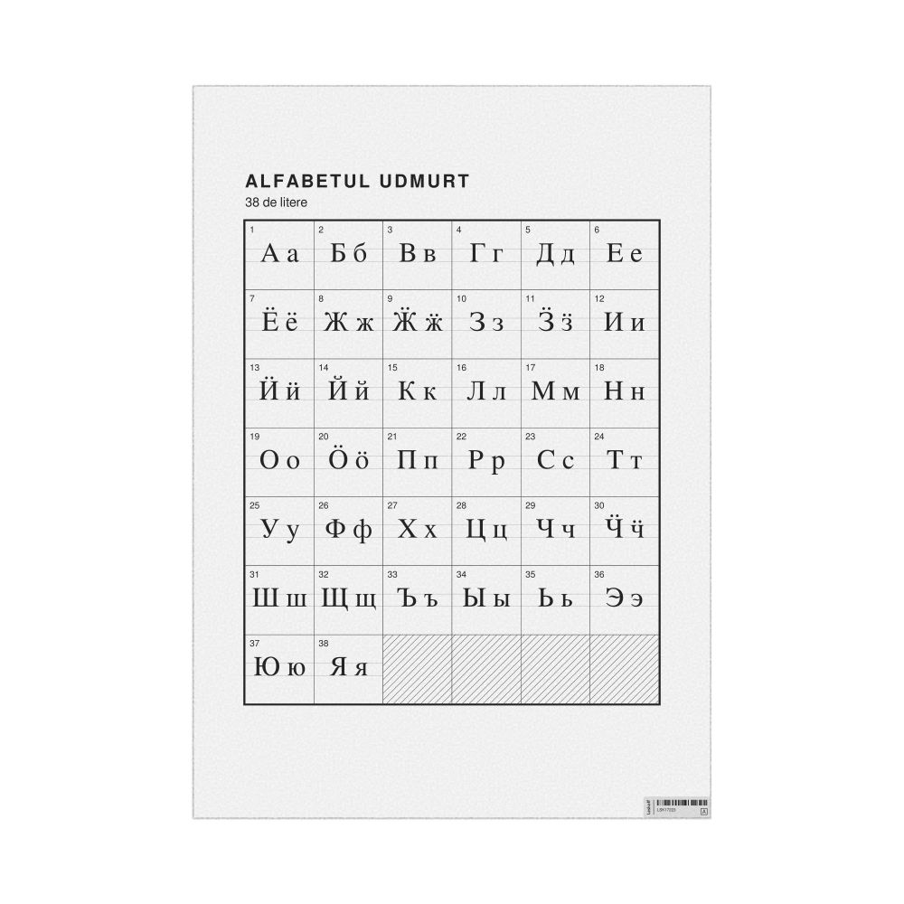 The Udmurt alphabet chart (the full set of letters) labeled in Romanian (Alfabetul udmurt) in the 23.4 x 33.1 in (59.4 x 84.1 cm, poster / wall chart) format.