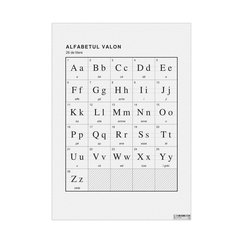 The Walloon alphabet chart (the full set of letters) labeled in Romanian (Alfabetul valon) in the 23.4 x 33.1 in (59.4 x 84.1 cm, poster / wall chart) format.