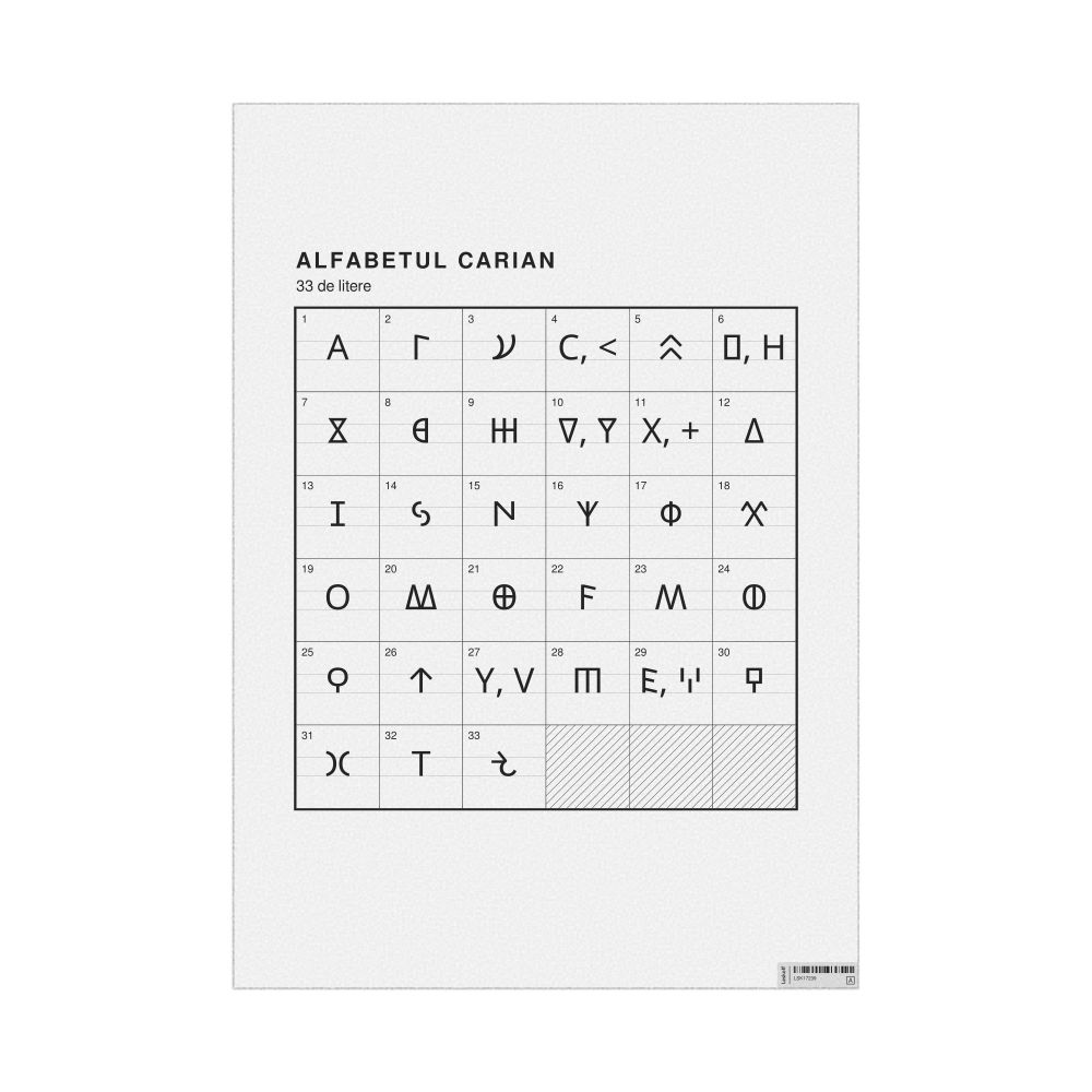 The Carian alphabet chart (the full set of letters) labeled in Romanian (Alfabetul carian) in the 23.4 x 33.1 in (59.4 x 84.1 cm, poster / wall chart) format.
